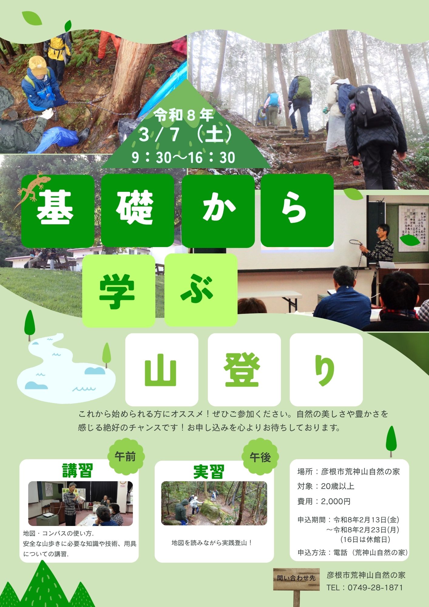自然の家では今年度も自然体験活動やキャンプ、陶芸など様々な自主事業を実施します。 令和7年度 イベントガイド ★(自主事業)令和8年 3月開催 ◎基礎から学ぶ 山登り 3月7日(土) 【参加者受付】2月13日(金)~2月23日(月)午前8時30分~午後5時まで、電話で受付けます。<FAX不可> (2月16日(月)は休館日)